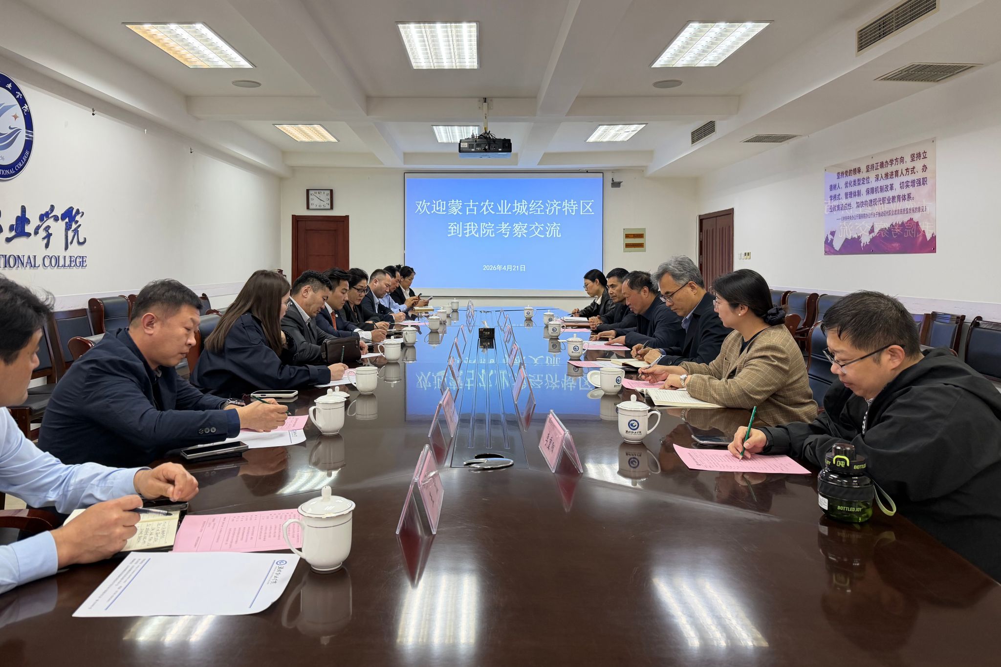 4月21日,蒙古国首都公民会议代表、农业城经济特区负责人甘巴特·巴特巴雅尔率代表团一行9人莅临我院考察交流,聚焦国际学生联合培养、农业种植技术人才培训等重点领域,与我院开展务实洽谈、共谋合作发展。学院党委委员、副院长付一明会见客人,国际交流与合作处、继续教育学院、农林科技学院相关负责人及教师参加座谈。
